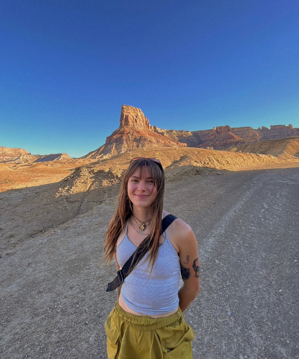 Born in Salt Lake City, Utah, Lizzie Wenger (b. 2001) has long been captivated by the colorful, fragile, and unique landscapes of the southwest. After her father’s passing when she was 12, Lizzie began to explore grieving and healing with the outdoors serving as a guide. Climbing, canyoneering, biking, and hiking were some of the activities that empowered her throughout this period, and continue to do so. Now an avid mountaineer, rock climber, and general action sport enthusiast, her free time is spent exploring the mountains and canyons of the west.
